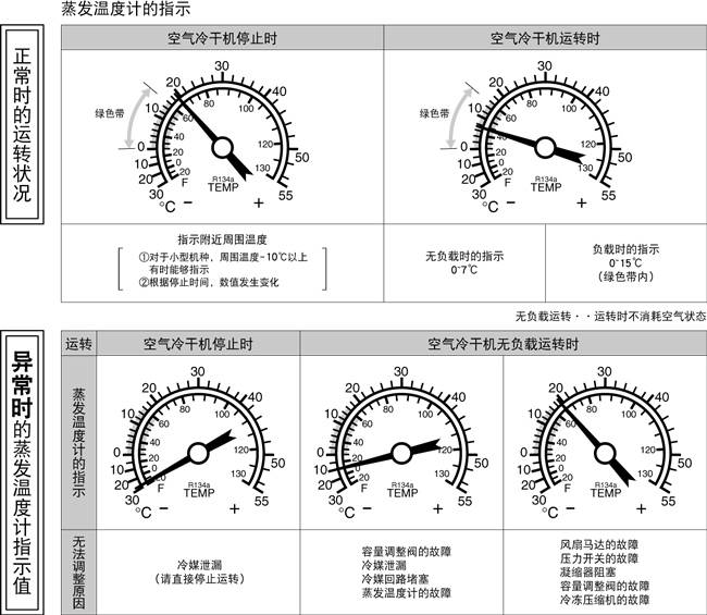 所谓的蒸发温度计、是将冷媒压力换算成冷媒温度、作为蒸发温度表示的计器。蒸发温度计能够确认冷干机是否正常工作。冷干机运转时、请确认蒸发温度计的表示是否在绿色带范围内。所谓蒸发温度计,是将制冷剂压力转换成制冷剂温度并代表蒸发温度的仪表。蒸发温度计可以确认冷干燥器是否工作正常。请确认冷干燥机运行时蒸发温度计的指示在绿色范围内。