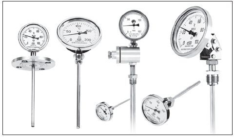 测量气体和液体的温度。与玻璃温度计相比,它具有无汞损坏、读数清晰、坚固耐用的优点。我生产多用途双金属温度计,规格品种齐全,质量稳定可靠,可广泛应用于工业、农业、国防和科研领域的各个部门。双金属温度计结构特点和工作原理双金属 温度计(以下简称温度计)使用螺旋加热器双金属板作为温度传感元件,并将其安装在保护套中,一端固定(固定端),另一端(自由端)连接到薄轴上,轴端带有指针。当温度变化时,温度传感元件的自由端立即旋转,并通过细轴驱动指针以指示刻度盘上的温度变化。直行温度计通过转向传动机构驱动指针。外壳材料包括钢板、铸造铝合金和不锈钢板??傻鹘嵌任露燃频耐凡靠山柚ㄎ乒?、转角机构和其他部件从角度调整为直线或从直线调整为角度。