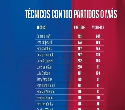 弗里克执教巴萨前100场收获75胜,队史仅次于恩里克