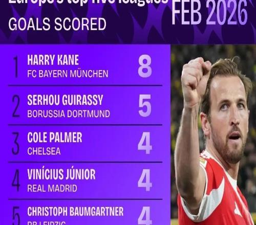 据Squawka统计,拜仁中锋哈里-凯恩在2月的德甲联赛中打入8球,高居五大联赛射手榜之首。多特前锋吉拉西打入5球,...