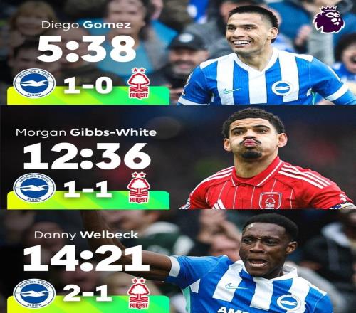布莱顿vs诺丁汉森林的英超联赛正在进行,两队在前15分钟轰入3球。据英超官方统计,这是本赛季英超首次出现这样...