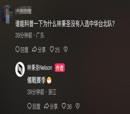 林秉圣此前曾入选中国台北男篮代表队,但在此次窗口期落选,无缘出战世预赛,有球迷在评论区询问为什么落选,林秉圣回复道是为了备战赛季。