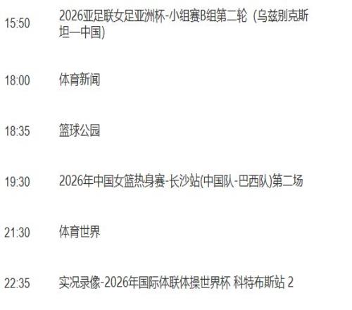 同样,中超首轮在3月7日、8日分别进行的5场、2场比赛,暂时也都没有进入央视节目单。不过,从节目单来看,央视似乎预留有转播窗口。比如,3月7日下午时段,CCTV5安排播出的是2026年米兰科尔蒂纳冬残奥会-轮椅冰壶混合团体(美国-中国);CCTV5+则都是实况录像(2026年世界职业拳王争霸赛3、2025/2026赛季斯诺克威尔士公开赛2、2026年世界泳联跳水世界杯 加拿大站1),完全具备转播条件。相应时段的比赛有:天津津门虎VS重庆铜梁龙,山东泰山VS辽宁铁人,上海申花VS大连英博。