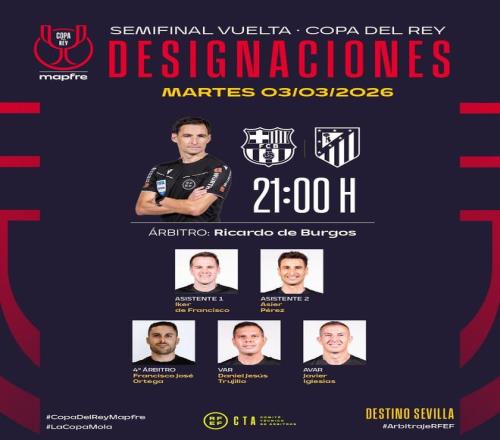 北京时间3月2日,西班牙足协官方公布了国王杯半决赛次回合,巴萨主场对阵马竞的裁判组名单,布尔戈斯担任主裁判。首回合马竞主场4-0大胜巴萨。