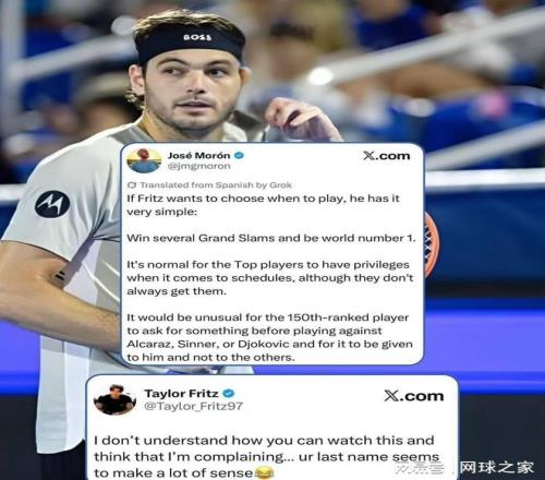 弗里茨的言下之意再清楚不过:我不过是在陈述巡回赛的客观事实,你却跳出来给我上课,说我想“要特权”?简直是莫名其妙。最后那个姓氏梗,更是精准打击,带着几分嘲讽的笑意,让这场口水战瞬间充满了戏剧性。