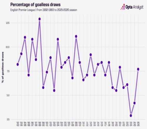 过度看重定位球战术,导致英超0比0比赛数量上升。本赛季英超已有19场0比0的比赛,超过2024/25赛季(16场)和2023/24赛季(11?。?,白卷比赛占比(6.8%)也连续3个赛季上升。白卷场次增加与进球数下降正向相关,各队痴迷定位球得分,导致射门数也在下降。本赛季场均射门次数(24.4次),是2003/04赛季以来第二低,仅高于2020/21赛季(场均24.2次)。那个赛季因疫情,大部分比赛球员发挥都低于预期。