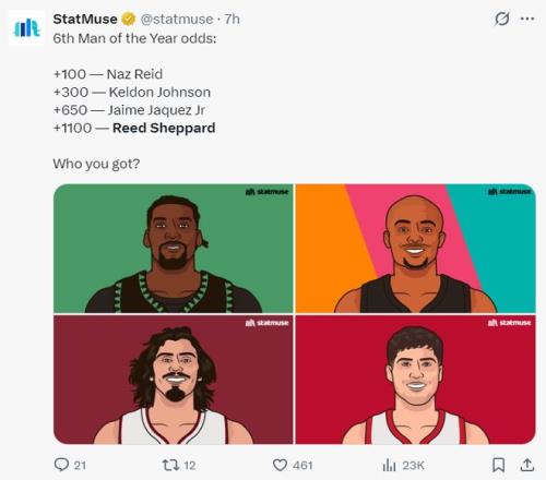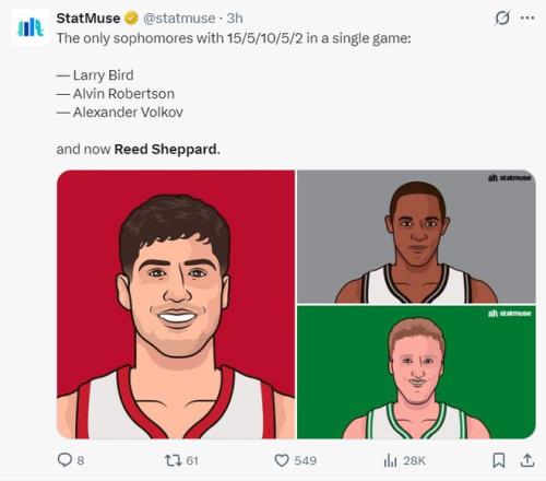 谢泼德也排在最佳第六人第四的位置,里德第一、凯尔登第二、小哈克斯第三、谢泼德第四。