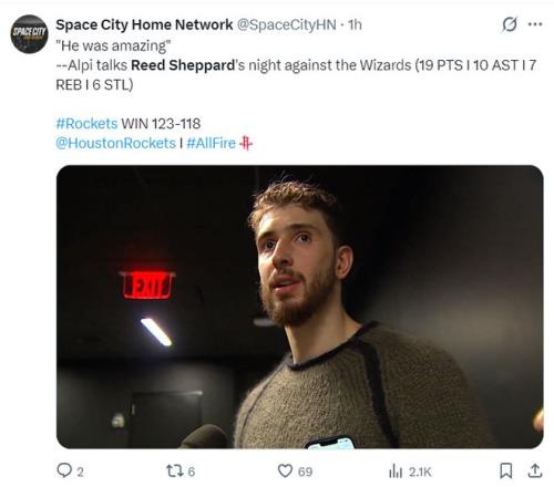 此役后谢泼德最近四场比赛,场均35.2分钟,拿到20.3分5.3助攻4.5篮板2.5抢断1.3盖帽,三分命中率44.4%,他本赛季先发的9场比赛火箭7胜2负。