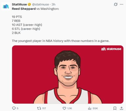 4.谢泼德成为最年轻拿到19+10+7+6+2数据的球员;