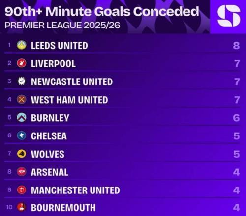 更让人担忧的是利物浦在比赛末段的崩盘频率。据统计,本赛季英超90分钟或以后丢球榜上,利物浦以7球并列次席,仅次于利兹联的8球。这意味着利物浦不是被绝杀,就是在被绝杀的路上。