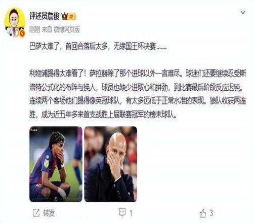 詹俊在赛后点评中直言不讳:“利物浦踢得太难看了!萨拉赫除了那个进球以外一言难尽。球迷们还要继续忍受斯洛特公式化的布阵与换人,球员也缺少进取心和拼劲,到比赛最后阶段反应迟钝。”