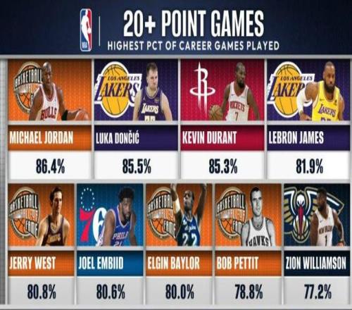 此外,东契奇还创下了NBA历史第2的神迹。数据显示,NBA历史20+场数占比:迈克尔乔丹以86.4%独居第1,东契奇(85.5%)高居第2、杜兰特(85.3%)第3、詹姆斯(81.9%)排名第4。