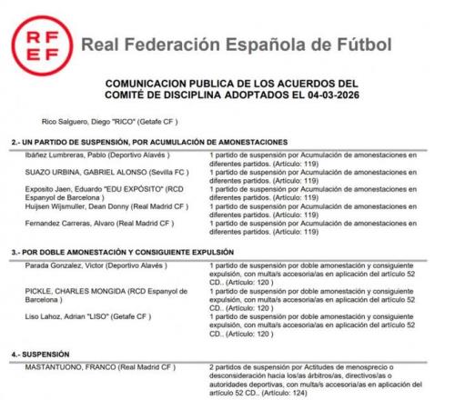 由于吕迪格没有出现在判罚名单当中,关于西甲裁判偏袒皇马的话题也被更多球迷讨论,虽然皇马多次表达了对判罚的不满,但是包括吕迪格膝击对手,巴尔韦德挥拳击打对手在内的皇马球员多次犯规也都没有得到应有的处罚,自然也引发了球迷的讨论和不满。在这份名单当中,看起来是皇马三名球员被禁赛,但其实真正遭遇禁赛的只有18岁的马斯坦托诺,赫伊森和卡拉雷斯都是因为累计黄牌才停赛的。