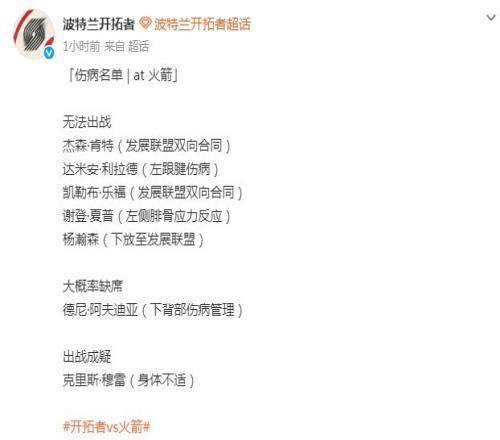 开拓者伤病报告: