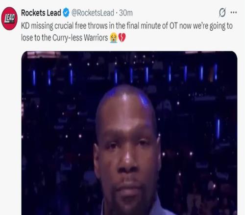 火箭媒体:加时赛关键时刻杜兰特丢了绝平的罚球,我们又一次输给没有库里的勇士。
