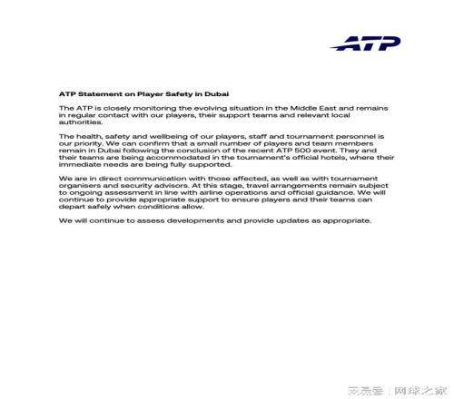 ATP 就迪拜球员安全问题发布了以下声明。声明最后写道:“我们将继续评估事态发展,并在适当时提供更新?!闭萆骶劢褂诎踩胄鳎锲3掷渚驳纤?。