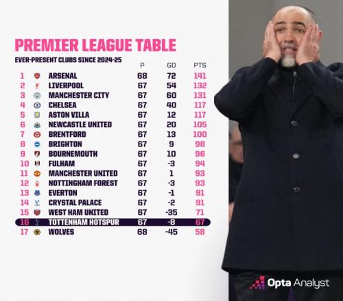 上赛季以来英超积分排名:阿森纳141分居首,热刺67分倒数第二