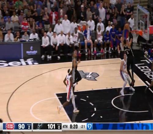三节打完时,文班亚马其实已经得到34分,可惜的是,第四节他只得到了4分,无缘生涯第7次40+,不过这一节,文班亚马有一个攻防转换非常漂亮,防守端帽掉了坎宁安,快攻完成了空接。