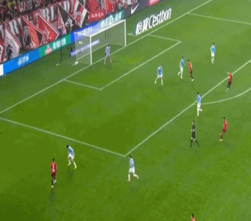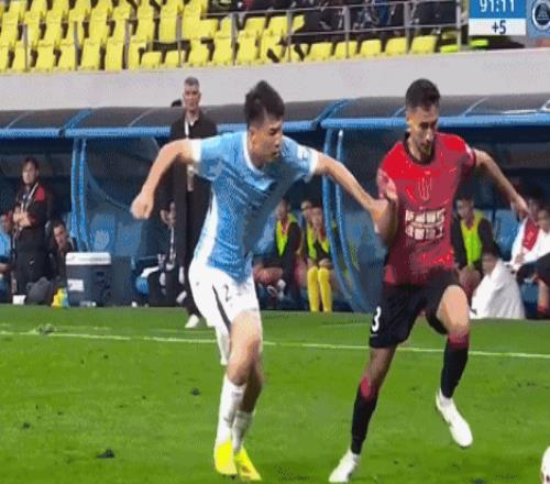 这是最后时刻,成都蓉城替补上场的亚历斯祖带球突入禁区,深圳新鹏城的后卫杨一鸣在防守过程中,有一定的手上动作,随后亚历斯祖倒地,主裁判没吹点球。
