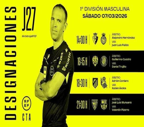 西班牙足协官方公布了当地时间周六4场西甲比赛的裁判安排,何塞-穆努埃拉将执法巴萨客战毕尔巴鄂竞技。