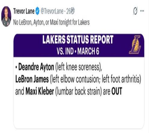 左肘挫伤+左脚关节炎!老詹今日缺战步行者湖人共计三人无法出场