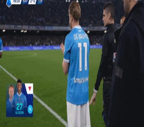 第79分钟,换人调整,德布劳内替补登场,换下阿利松-桑托斯