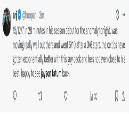 时隔298天轰15+12+7!塔图姆首秀登全美热搜美记:仿佛从未离开