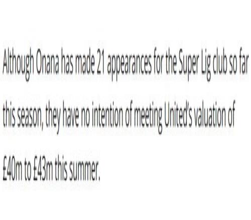 特拉布宗体育租借奥纳纳的合同中,并没有任何买断选项或者强制性义务,要想完成转会,就必须与曼联谈妥转会费。然而,双方在价格上的差异相差太大。