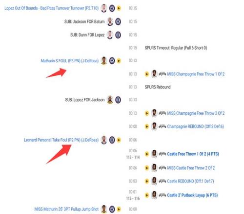 终场前8秒尚帕尼传给卡斯尔后,伦纳德只能对卡斯尔犯规,卡斯尔两罚一中,终场前3秒卡斯尔补篮命中直接锁定胜局,伦纳德在这决胜15秒只贡献了一个犯规。