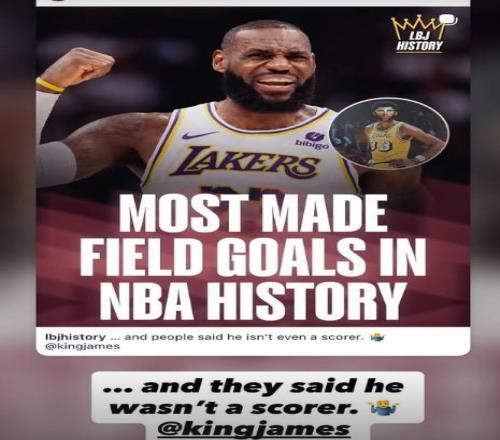 北京时间3月6日,湖人球星勒布朗-詹姆斯达成NBA历史进球榜第一的里程碑,赛后他转发了自己进球榜第一的海报,并配文:他们说他不是一个得分手。