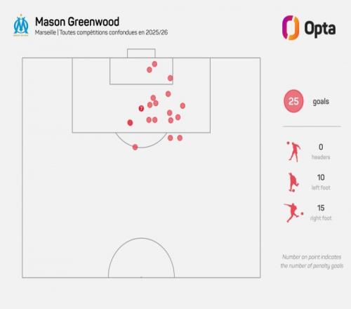 据Opta统计,格林伍德本赛季打进25球,其中左脚10球,右脚15球,他是本赛季五大联赛唯一各赛事左脚、右脚进球皆10+球员。