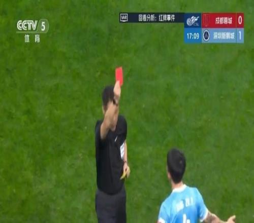 本场比赛的导火索,是开场16分钟的VAR改判。深圳队姜至鹏在防守中抬肘,击中成都外援韦林顿面部,导致后者流血不止,最终缝了15针、牙齿脱位。主裁判原本出示黄牌,经VAR提醒后改判直红,深圳队被迫10人作战,随后防线彻底崩盘,最终吞下1-5的惨败。